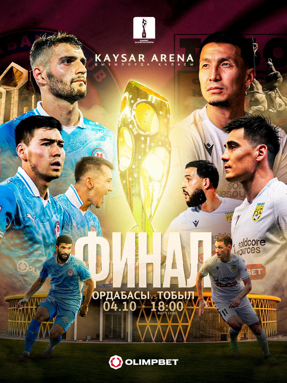 4 октября в Кызылорде состоится финальный матч Кубка Казахстана по футболу, в котором сыграют шымкентский “Ордабасы” и костанайский ‘Тобол”, передает Liter.kz.