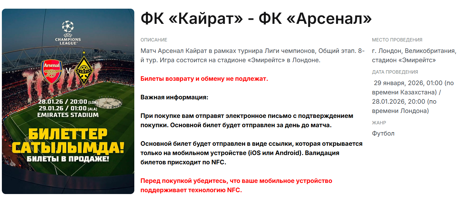 Билеты в гостевой сектор уже доступны для приобретения через мобильные приложения Qairat SuperApp и Freedom SuperApp. Возврат билетов не предусмотрен.
