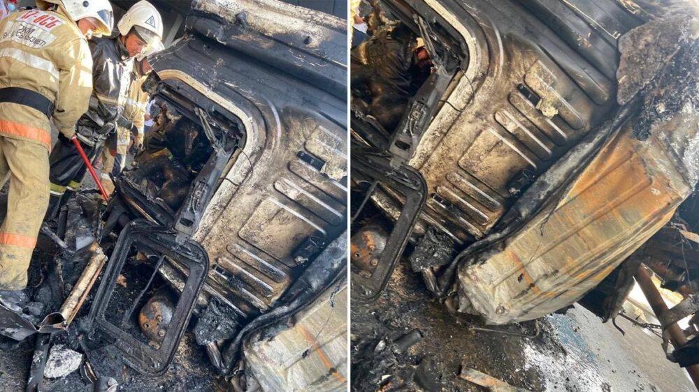 Оба – граждане Кыргызстана. Машина была полностью уничтожена огнем. Пожар удалось потушить только через час после происшествия. В спасательной операции задействовано 32 сотрудника и девять единиц техники ДЧС области, полиции и скорой помощи.