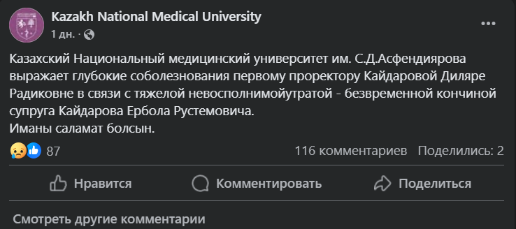 “Казахский Национальный медицинский университет им. С.Д.Асфендиярова выражает глубокие соболезнования первому проректору Кайдаровой Диляре Радиковне в связи с тяжелой невосполнимой утратой - безвременной кончиной супруга Кайдарова Ербола Рустемовича”, – говорится в сообщении вуза.
