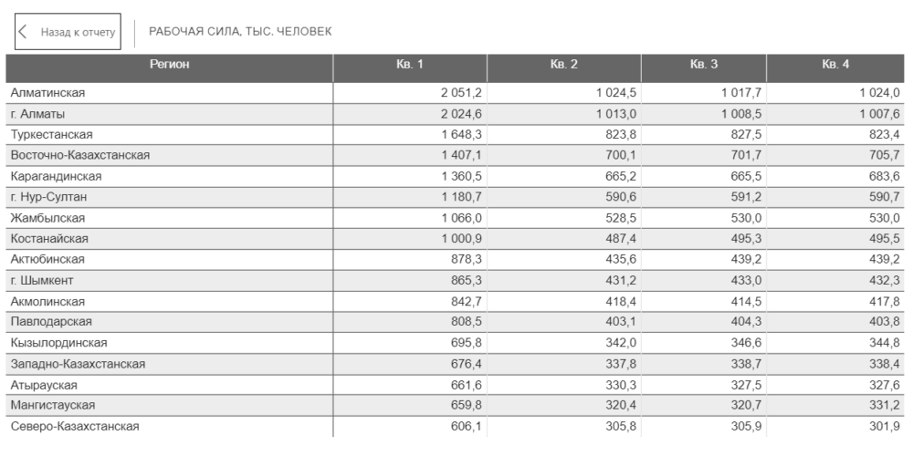 Если говорить о рынке труда, то больше всего рабочей силы наблюдается в Алматинской области, городе Алматы и в Туркестанской области. Меньше всего зарегистрировано в Северо-Казахстанской области.