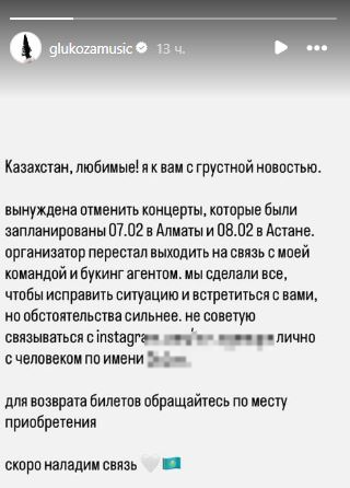 Глюкоза сообщила об отмене концертов в Алматы и Астане