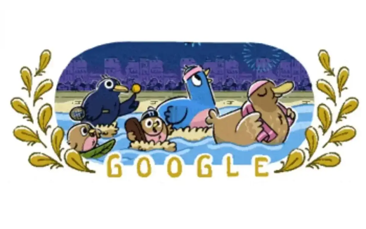 Новый логотип Google выполнен в анимационном стиле и создан специально для освещения Олимпийских игр. В центре изображения расположена группа мультяшных птиц, представляющих различные виды спорта, они изображены со спортивными аксессуарами, такими как плавательные шапочки, теннисные ракетки и мячи.