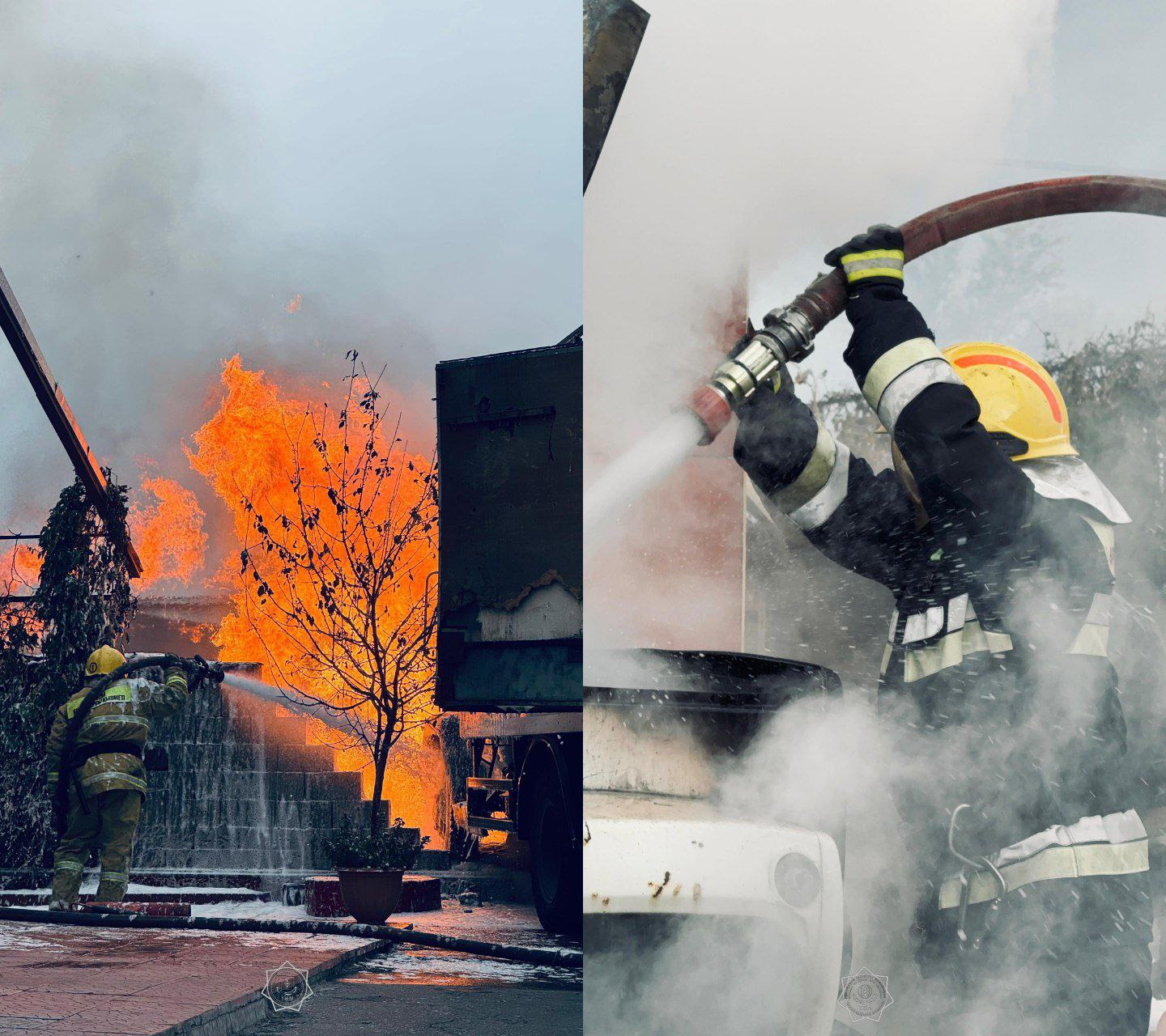 В результате ДТП загорелись кабина грузовика на площади 5 кв.м. и кровля хозпостройки на площади 4 кв.м. Наблюдалось открытое горение газа из поврежденной системы.