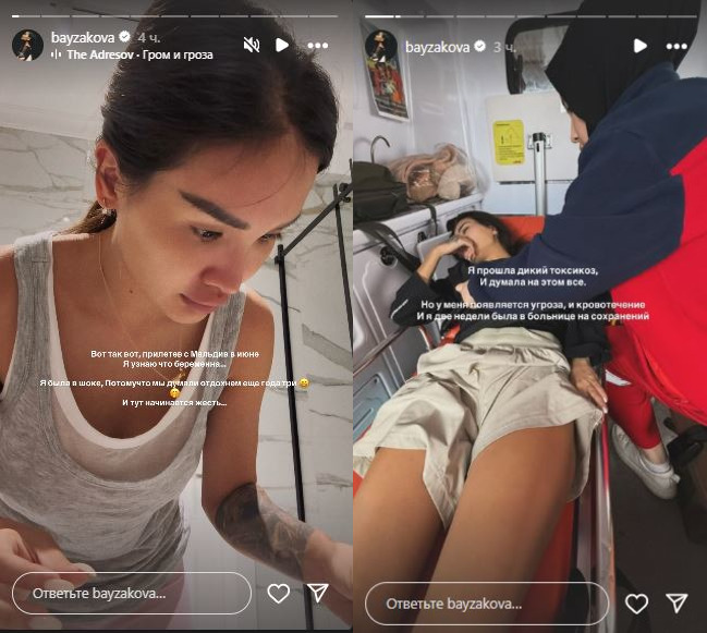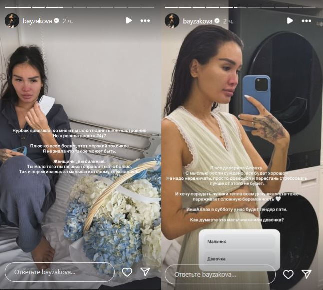 “Я две недели была в больнице на сохранении. Отменила много перелетов, мероприятий лежала и ждала. Нурбек приезжал ко мне и пытался поднять настроение. Но я ревела просто 24/7. Плюс ко всем болям этот мерзкий токсикоз. Я не знала, что такое может быть”, – поделилась Айжан Байзакова.
