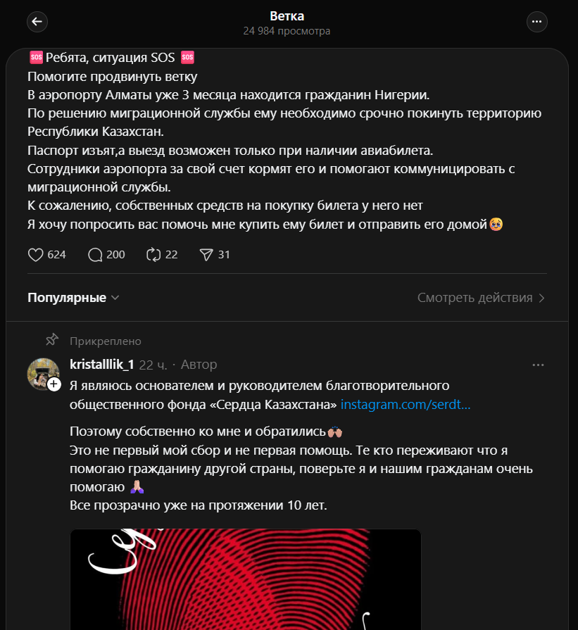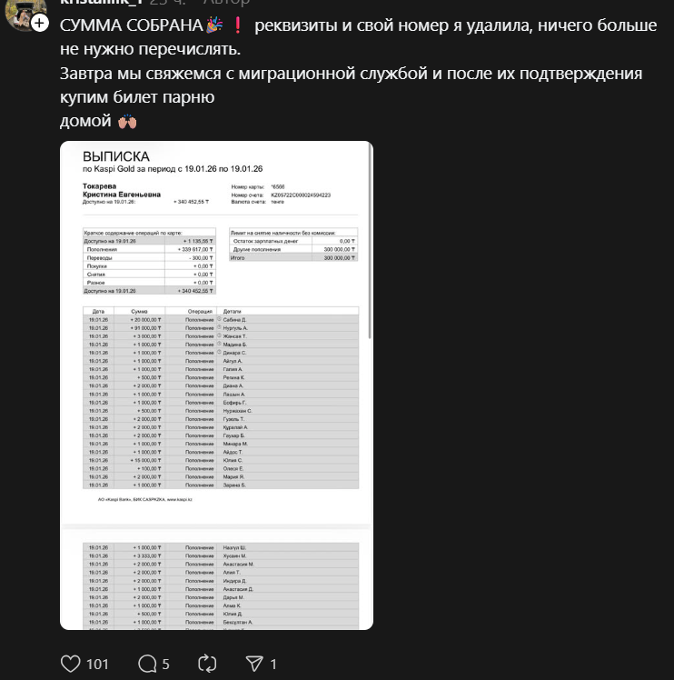 “Я хочу попросить вас помочь мне купить ему билет и отправить его домой”, – написала активистка в соцсетях, обратившись к неравнодушным казахстанцам.