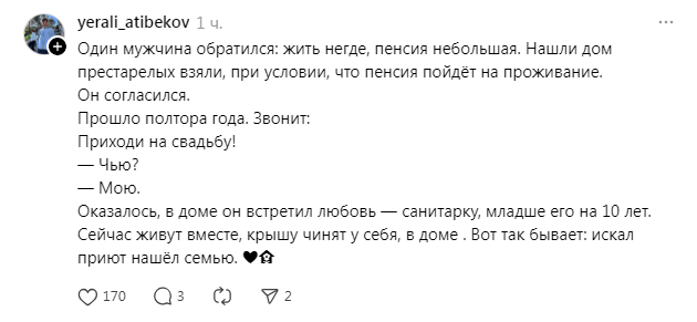 Ерали Атибеков, в своем аккаунте Threads, поделился историей одинокого алматинца, оказавшегося в трудной жизненной ситуации: без собственного жилья и с ограниченным доходом в виде пенсионных выплат.
