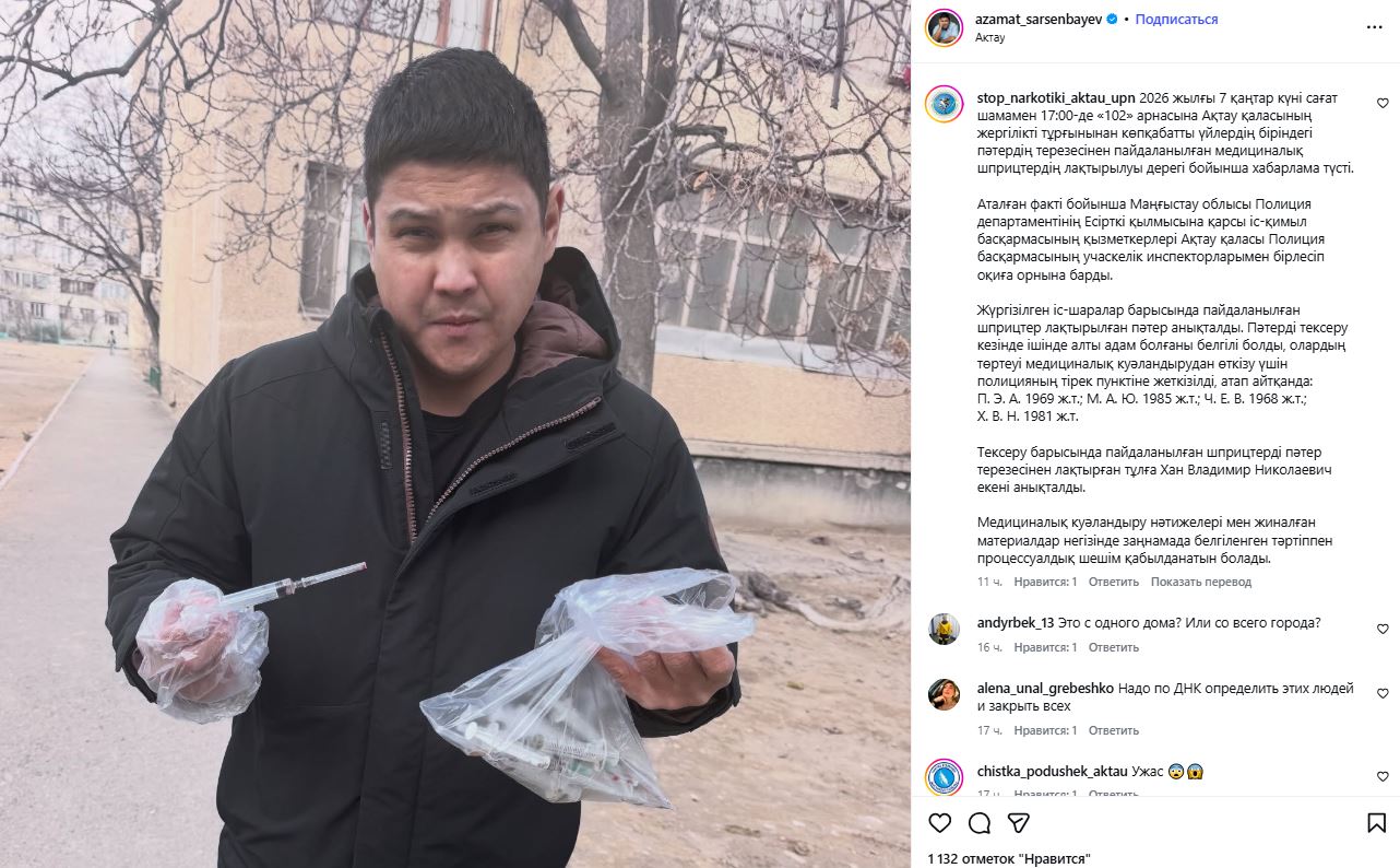 В одном из многоквартирных домов Актау из окна выбрасывались использованные медицинские шприцы. После публикации местного блогера и обращения в соцсетях, региональная полиция отреагировала и организовала проверку, передает Liter.kz.