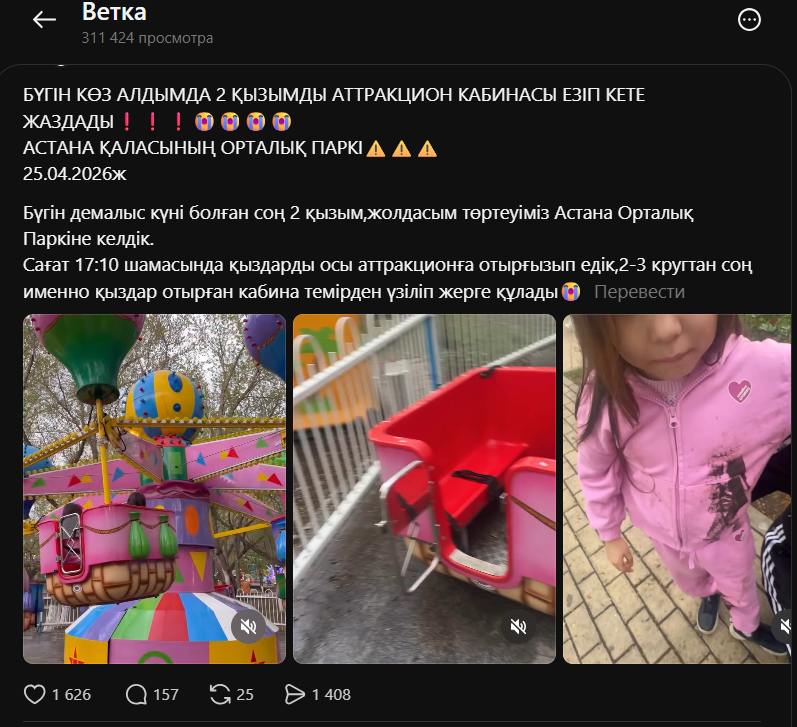 “Кабина, в которой сидели мои дочери, оторвалась от металлического крепления и рухнула на землю прямо на ходу”, – написала астанчанка.