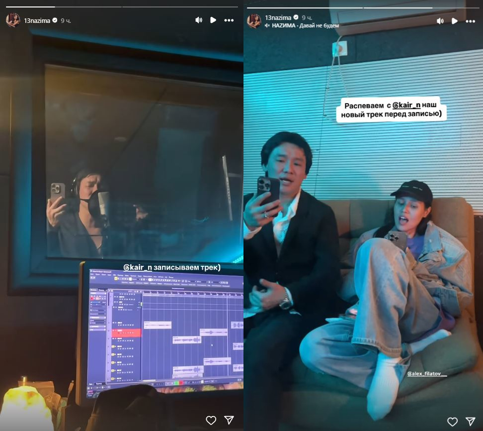 Об этом стало известно из социальной сети певицы, где она поделилась моментами творческого процесса. В опубликованных Instagram-stories Наzима показала, как вместе с Кайратом они репетируют и записывают новую композицию в студии.