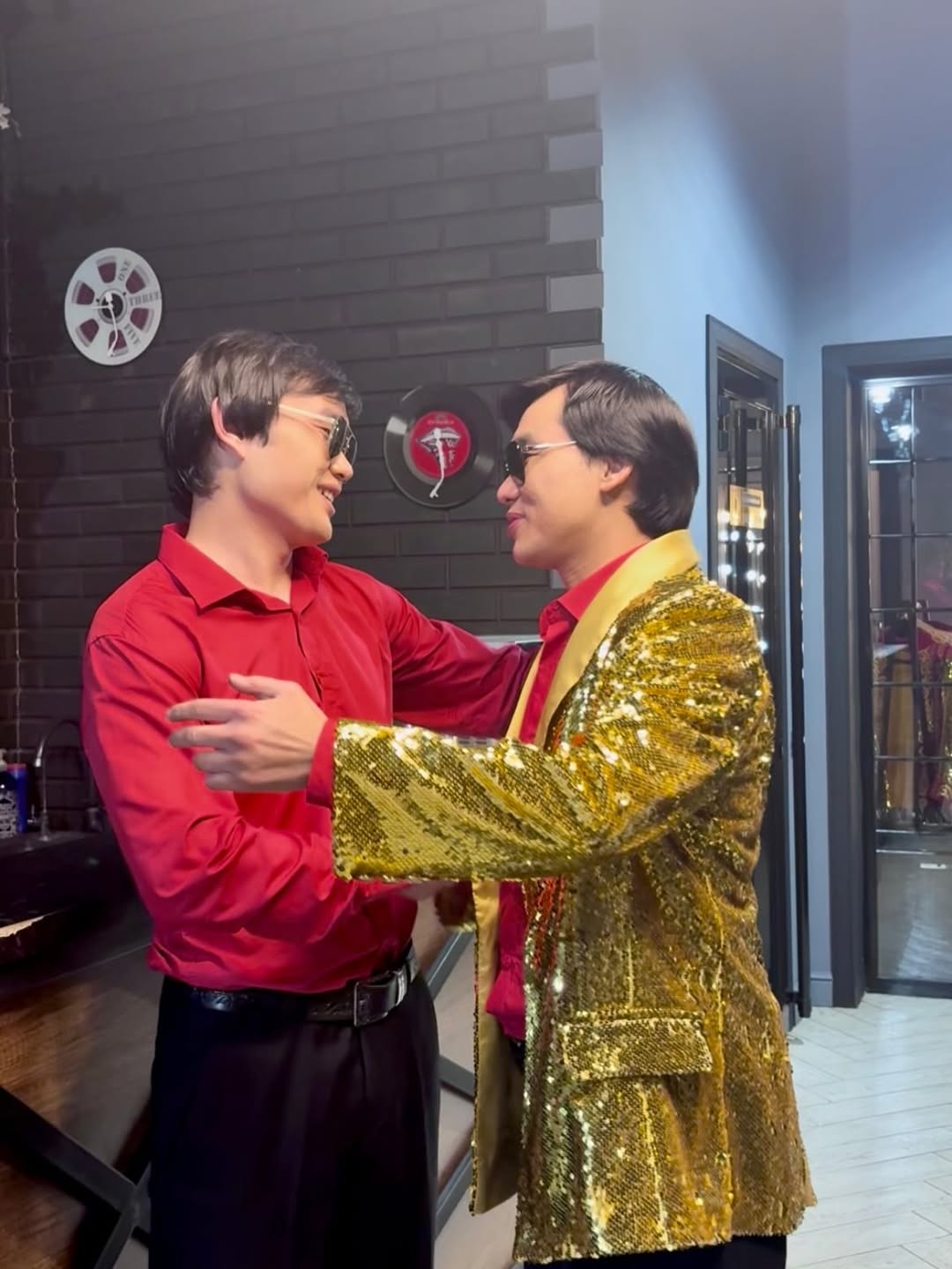 На снимках настоящий Кайрат стоит рядом с Асанали, который немного выше него по росту, но одет в точно такую же одежду: красную футболку, черные очки и брюки.