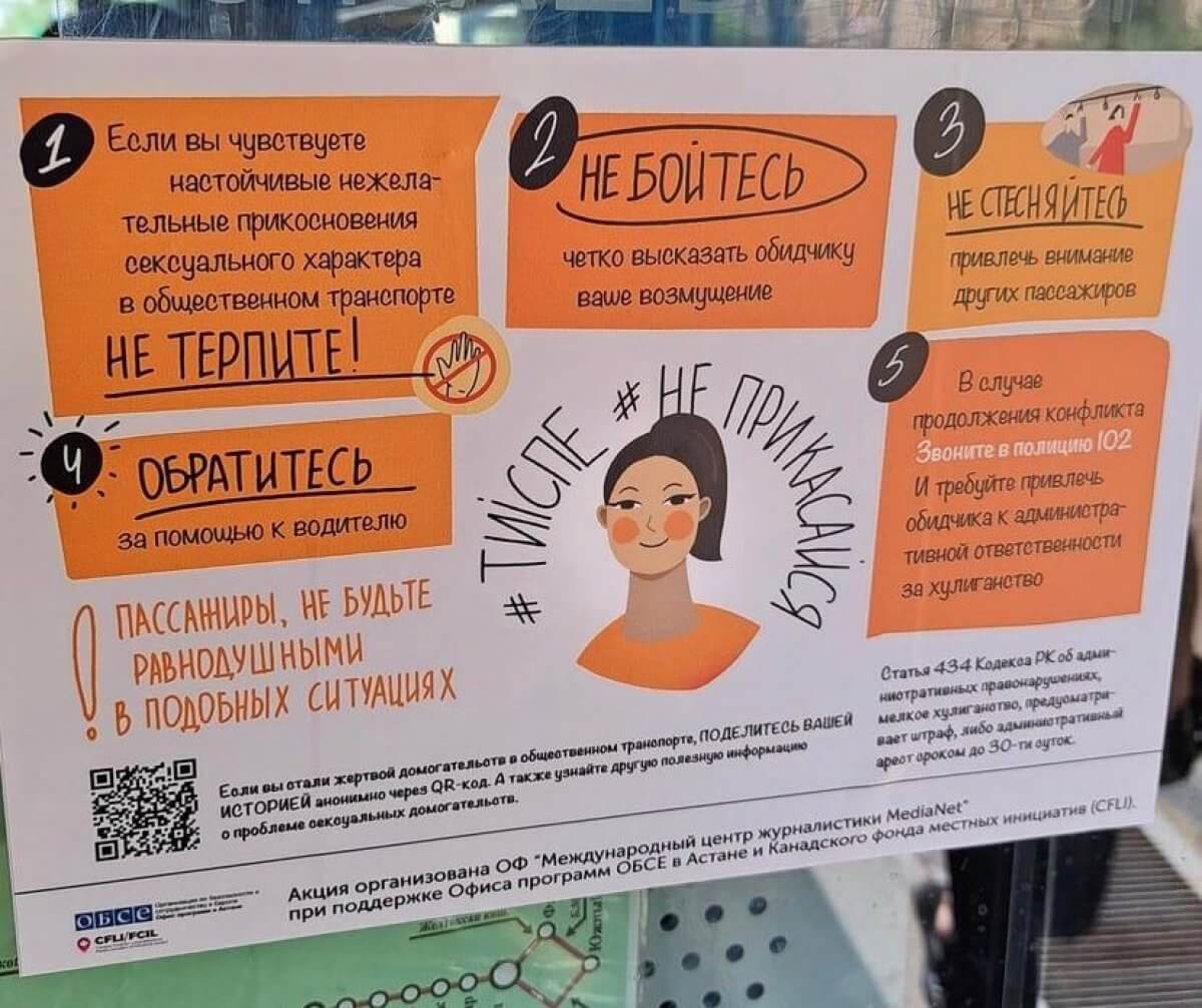 В Шымкенте уже был случай, когда в маршруте № 52 один из пассажиров смотрел на девушек и мастурбировал. Да, такое было, и девушки тогда растерялись. Поэтому нам нравится, что появились такие постеры, которые доступно объясняют, как действовать при харассменте в общественном транспорте, – рассказал замдиректора автопарка Альфараби Абдраша.
