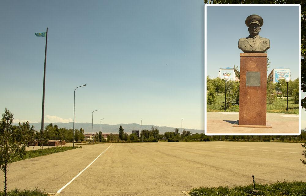 После въезда в городок поворачиваем влево и видим сквер, засаженный молодыми деревьями. В его центре – бюст первого министра обороны Казахстана Сагадата Нурмагамбетова. Сам сквер также носит его имя. В центре – большая, пустая асфальтированная площадка. Поначалу я не понял, зачем она нужна в парке. Может это парковка? Потом до меня доходит – это плац. Здесь собирают личный состав.