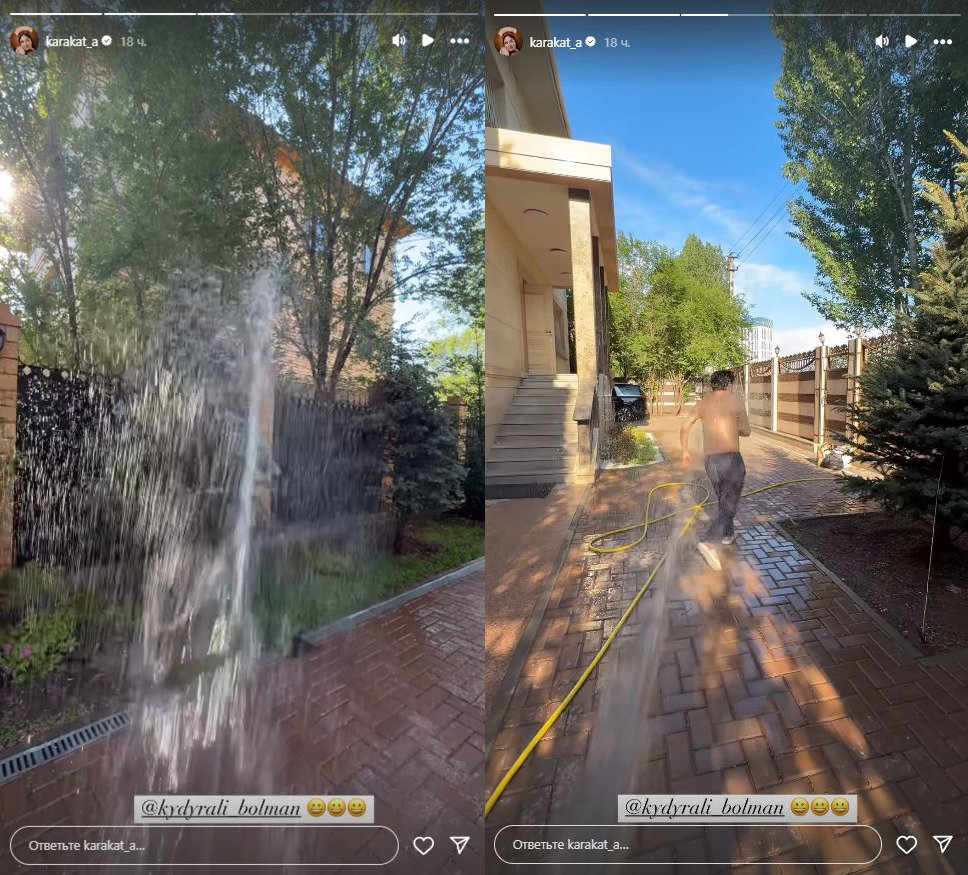 На кадрах видно, как Каракат ухаживает за растениями с помощью садового шланга. В какой-то момент к ней подходит ее супруг, известный певец и продюсер Кадырали Болманов. Когда он разворачивается, чтобы уйти, Каракат неожиданно направляет струю воды в его сторону, вызвав бурю смеха. Кадырали, не растерявшись, пускается в бегство, а Каракат смеется за кадром.