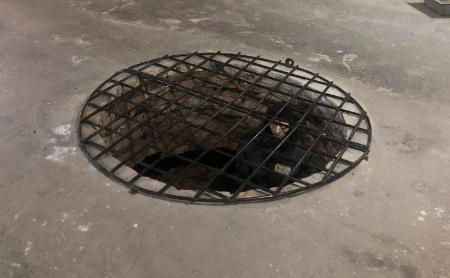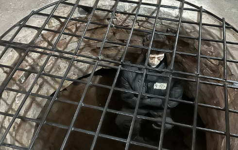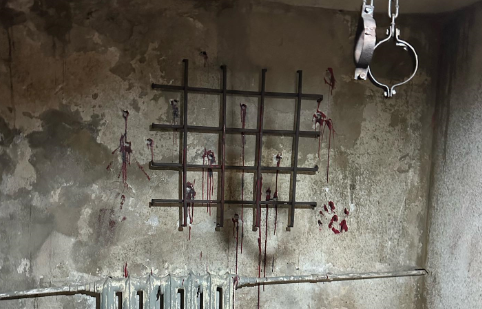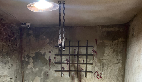 В зале, в котором представлены виды пыток, изображена инсталяция "ласточка", при которой подозреваемому сковывали руки и ноги за спиной и подвешивали в таком состоянии до момента, пока не услышат признание.