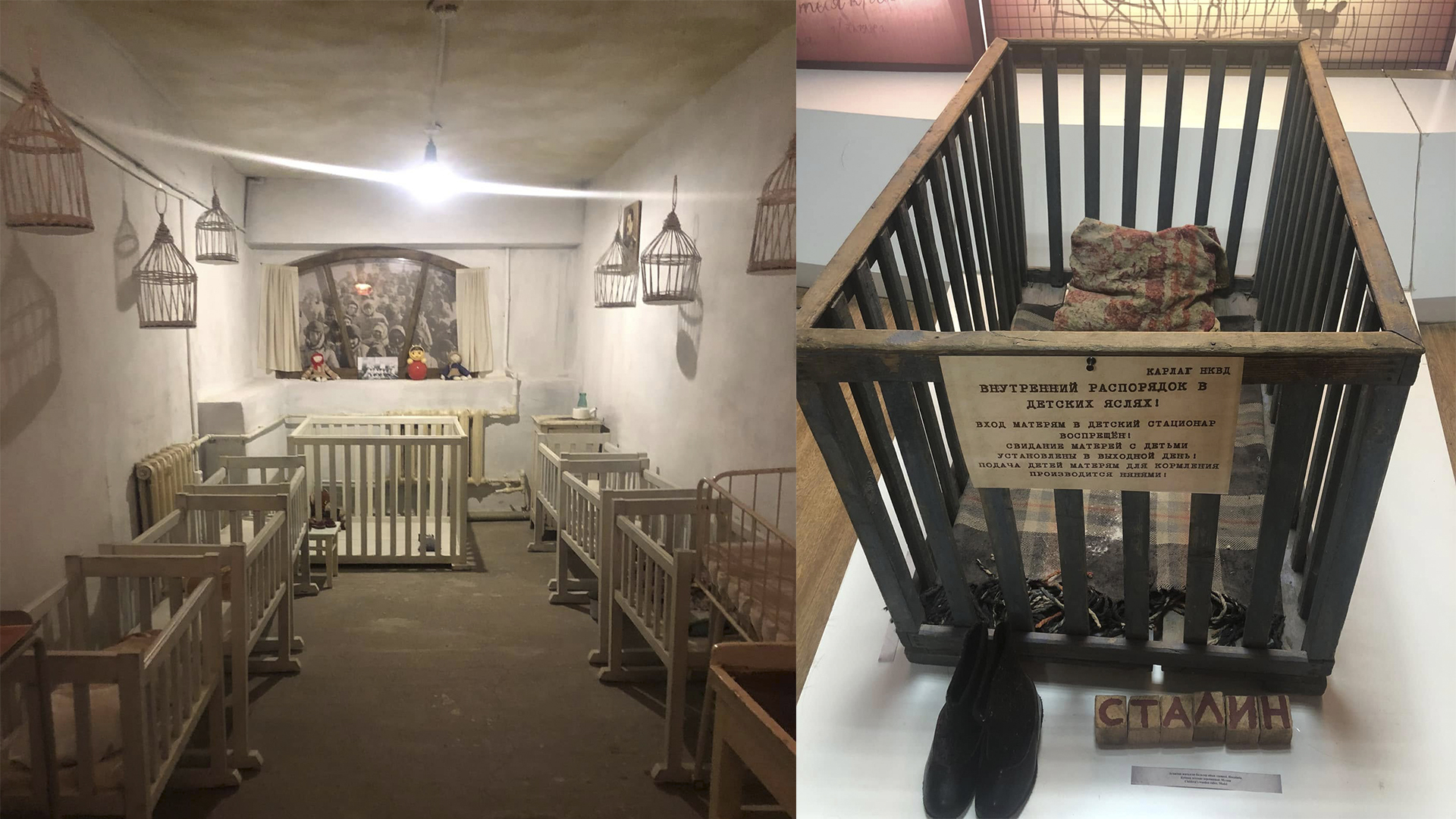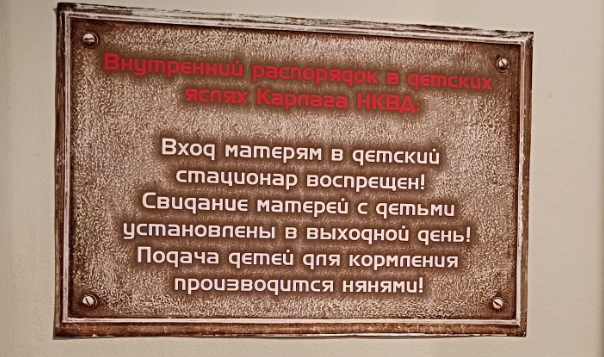 В одном из залов воссоздана типичная комната дома малютки, которые были в Карлаге. Здесь стоят деревянные кроватки, манежи и пеленальный столик.