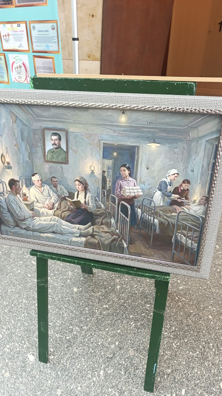 Отдельный пласт - тыл. В гуашевой работе по истории Салии Абушевой - больничные коридоры, где подростки после уроков мыли полы, стирали бинты и писали письма раненым. Это тихая, почти незаметная работа, без которой фронт не мог бы существовать.