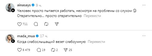 "Когда слабослышащий везет слабоумную", "Человек просто пытается работать, несмотря на проблемы со слухом. Отвратительно, просто отвратительно", "Я сам особенный человек, и мне больно от таких видео. Что вам сделал парень?", — написали пользователи.