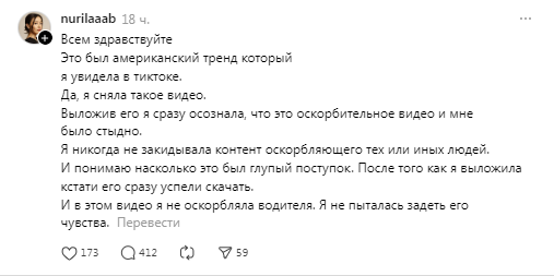 "Через несколько часов после публикации я удалила видео. Понимаю, что поступила неправильно. Если задела чьи-то чувства — прошу прощения. Это больше не повторится", — сказала блогер.