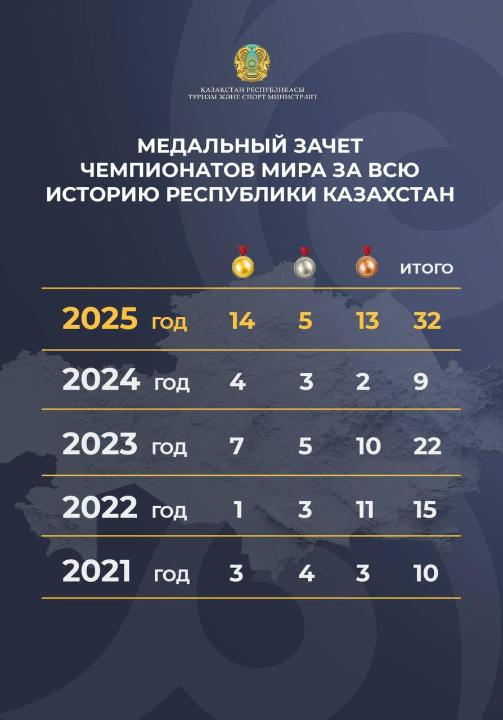 “Этот результат является рекордным за весь период независимости Казахстана. Для сравнения, предыдущий рекорд был зафиксирован в 2023 году, когда национальная команда завоевала 22 медали (7 золотых, 5 серебряных и 10 бронзовых). Таким образом, прирост по общему количеству наград в 2025 году составил +10 медалей, а количество золотых медалей увеличилось вдвое”, – сообщили в ведомстве.
