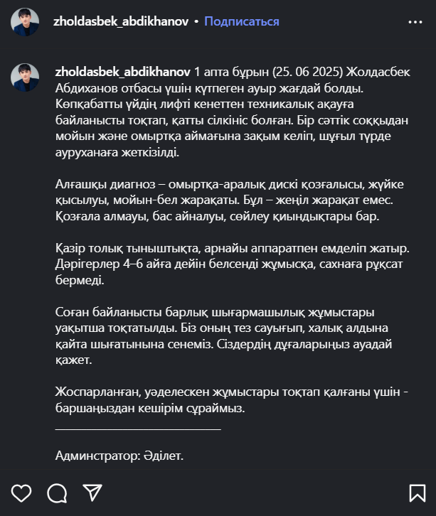 Представители Жолдасбека приносят извинения перед поклонниками за вынужденные изменения в графике и просят с пониманием отнестись к сложившейся ситуации.