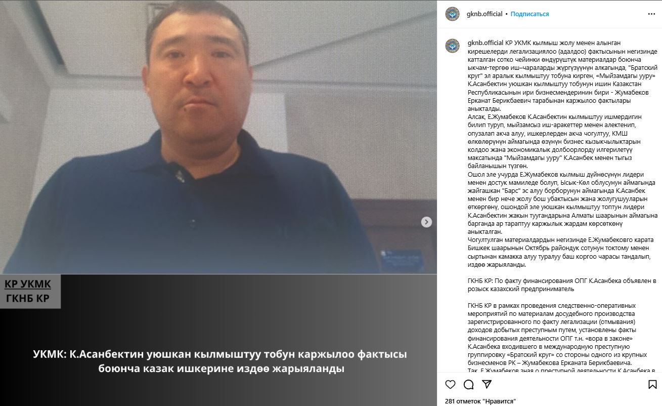 ГКНБ КР в рамках проведения следственно-оперативных мероприятий по материалам досудебного производства, зарегистрированного по факту легализации (отмывания) доходов, добытых преступным путем, установлены факты финансирования деятельности ОПГ так называемого “вора в законе” К.Асанбека, входившего в международную преступную группировку “Братский круг” со стороны одного из крупных бизнесменов РК – Жумабекова Ерканата Берикбаевича.