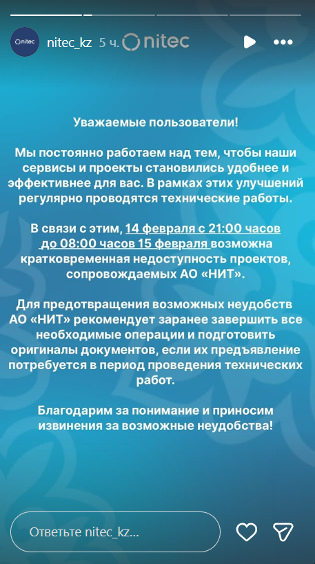 АО "Национальные информационные технологии" рекомендовало завершить все необходимые операции до 21:00 14 февраля и подготовить оригиналы документов, если их предъявление может потребоваться до утра 15 февраля, передает Liter.kz.
