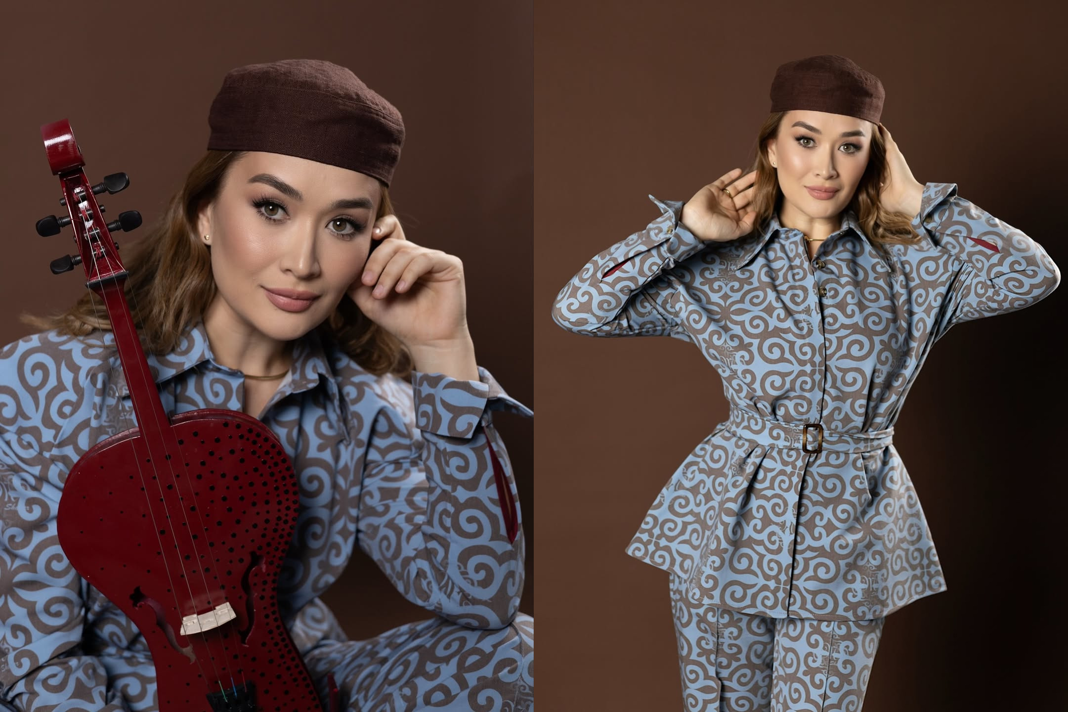 Акерке Буркитбай заснята в брючном костюме голубого цвета, который украшает национальный узор. Образ дополняет тюбетейка в тон. В руках у артистки кобыз.