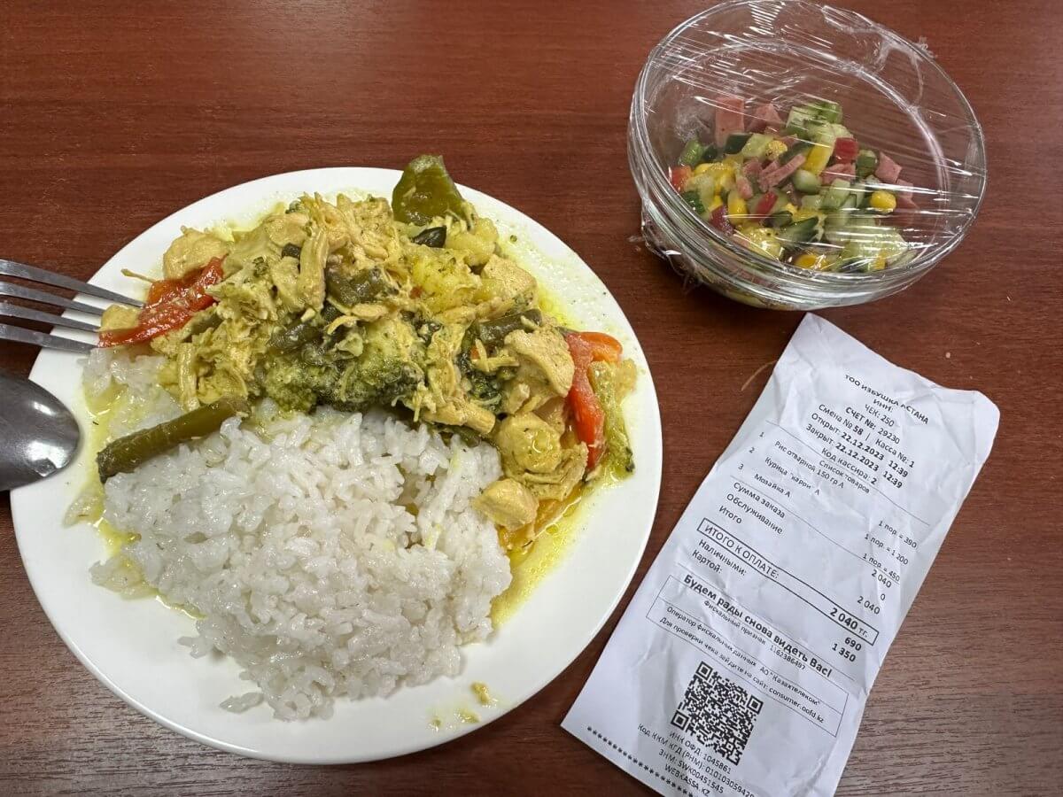 Был в обеденное время, выбора блюд нет. Из супов борщ и рассольник, из второго – курица кари, ну и аналогичное что-то. За гарнир риса я заплатил 390 тенге, за курицу 1 200, а за этот крохотный салатик 450 тенге. Национальной пищи нет. То, что там подают, не стоит этих денег, пища подается вся холодная. Себестоимость этого блюда 400 тенге, я заплатил в пять раз больше. В столовой меню нет, граммовка и состав блюд не указан, обслуживание при таких ценах ужасное. На кассе сколько скажут, столько и надо платить. Надо убирать за собой посуду, – написал он.