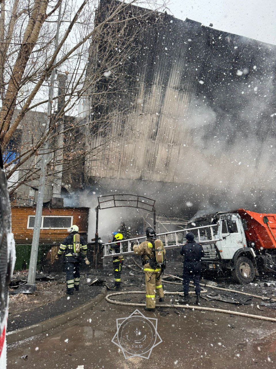 Как видно на распространяемых в социальных сетях видеокадрах, огонь перекинулся на соседнее здание — бывший кинотеатр “Синема сити”.
