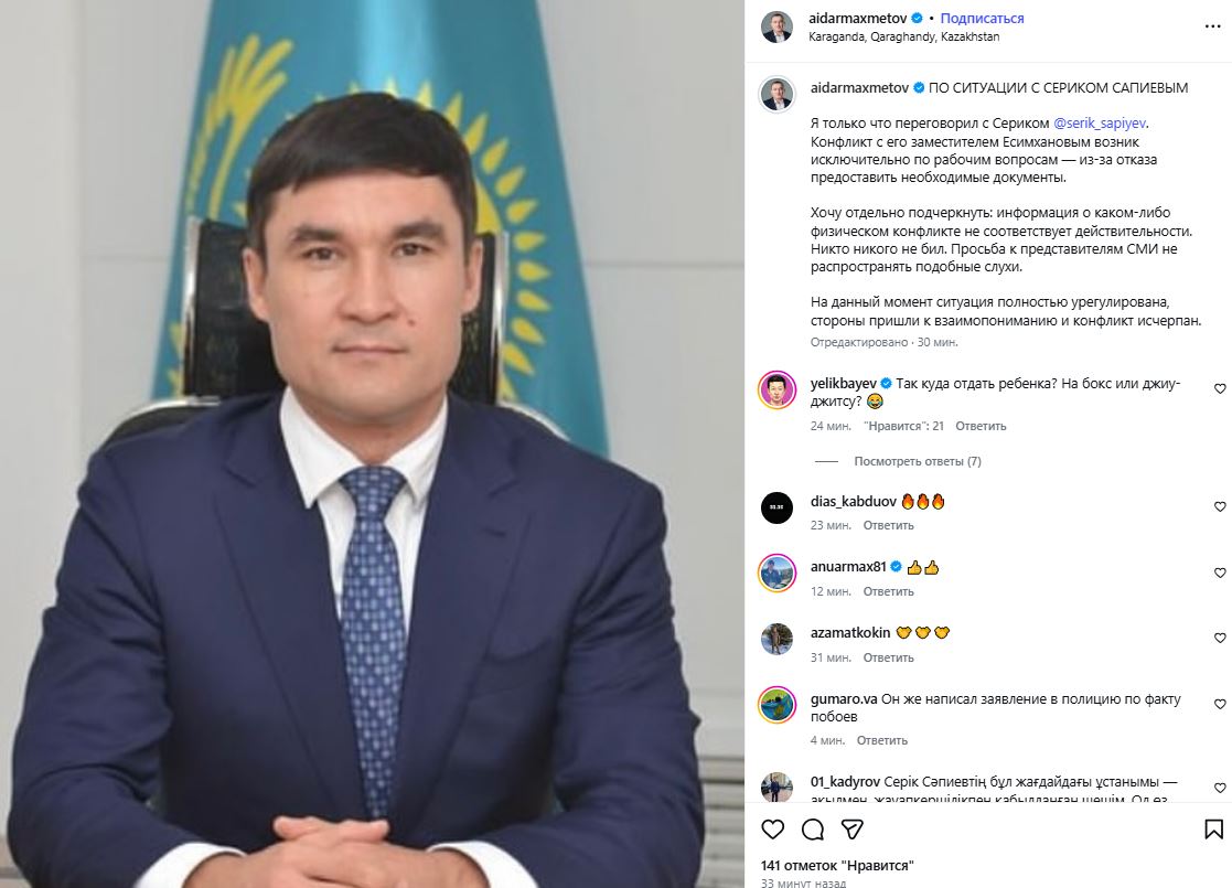 “Я только что переговорил с Сериком. Конфликт с его заместителем Есимхановым возник исключительно по рабочим вопросам — из-за отказа предоставить необходимые документы. Хочу отдельно подчеркнуть: информация о каком-либо физическом конфликте не соответствует действительности. Никто никого не бил. Просьба к представителям СМИ не распространять подобные слухи. На данный момент ситуация полностью урегулирована, стороны пришли к взаимопониманию и конфликт исчерпан”.