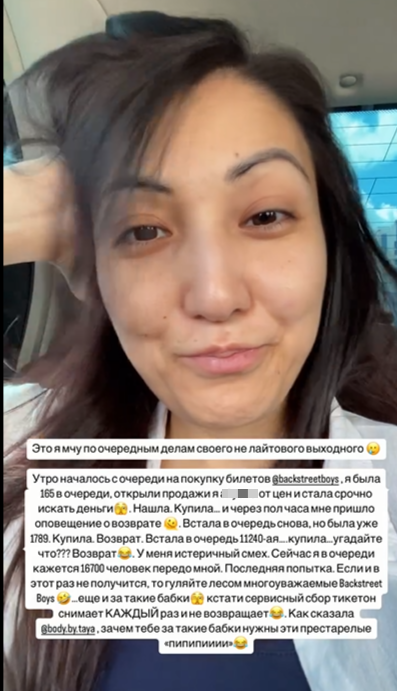 "Утро началось с очереди на покупку билетов Backstreet Boys, я была 165-й в очереди. Через полчаса мне пришло сообщение о возврате. Встала в очередь снова, но была уже 1789-й. Купила. Возврат. Встала в очередь 11 240-ая. Купила. Снова возврат. Сейчас я в очереди 16 700 какая-то", — заявила горожанка.