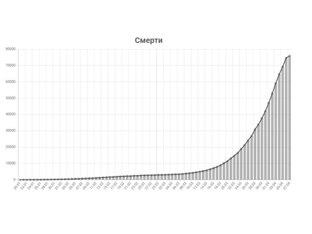 Скачок смертности. На данный момент количество погибших от коронавируса людей в мире составляет почти 70 тысяч человек. В одной Италии - 15 362 человека (данные на 6 апреля). Если контроль над вирусом будет потерян, то в будущем эти цифры будут куда больше, чем сейчас, говорят ученые. Учитывая вышеперечисленные факторы, и возможную мутацию вируса, можно предположить, что возможен резкий демографический спад мирового уровня.