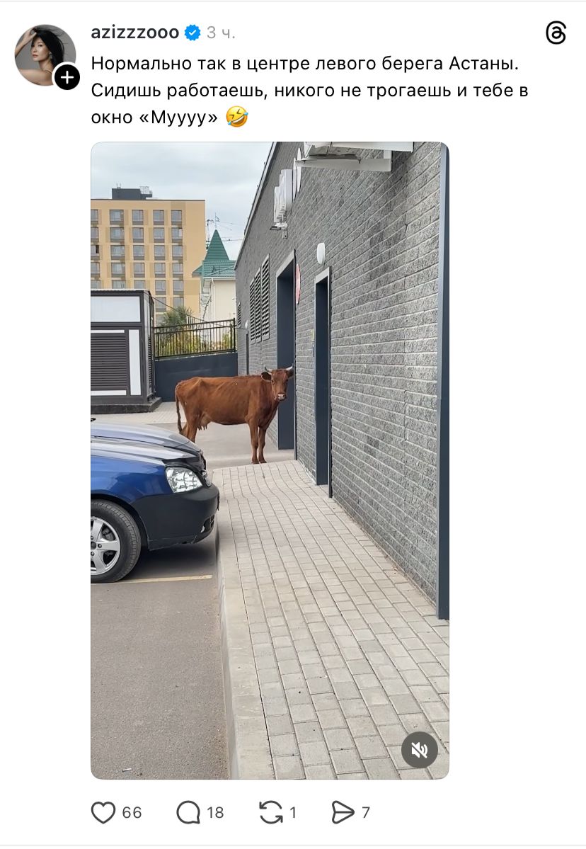 "Нормально так, в центре левого берега Астаны. Сидишь, работаешь, никого не трогаешь и тебе в окно "Муууу", — написала автор видео.