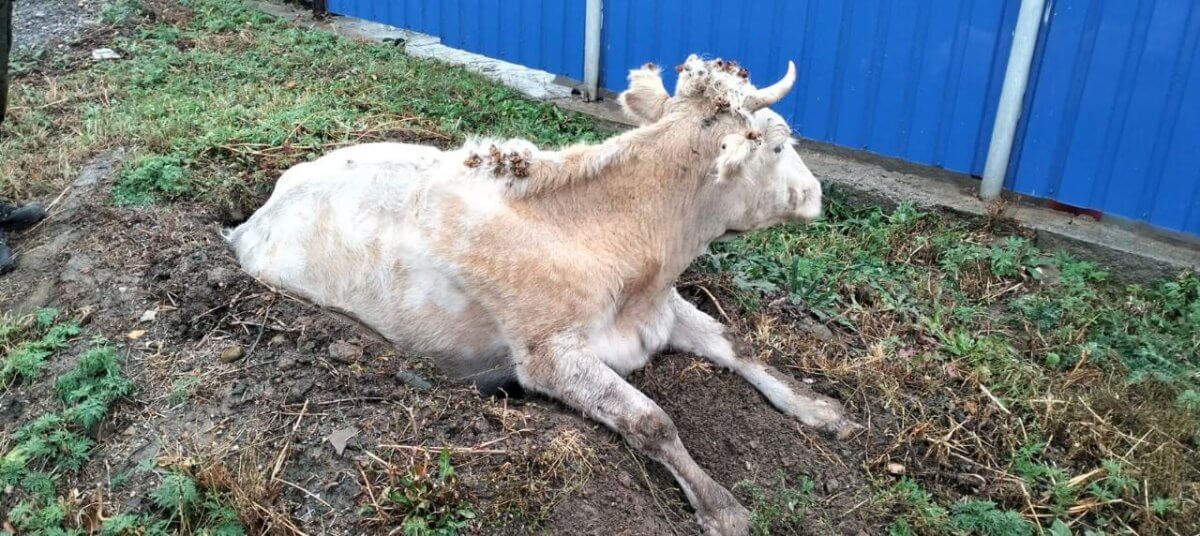 Корова провалилась в яму, прикрытую гнилыми досками.