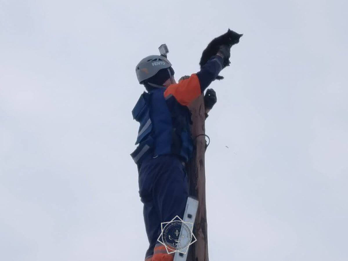 На помощь коту пришли спасатели оперативно-спасательного отряда. С помощью трехколенной лестницы спасатель Ербулан Кулсунов спустил животное со столба. Кот не пострадал.