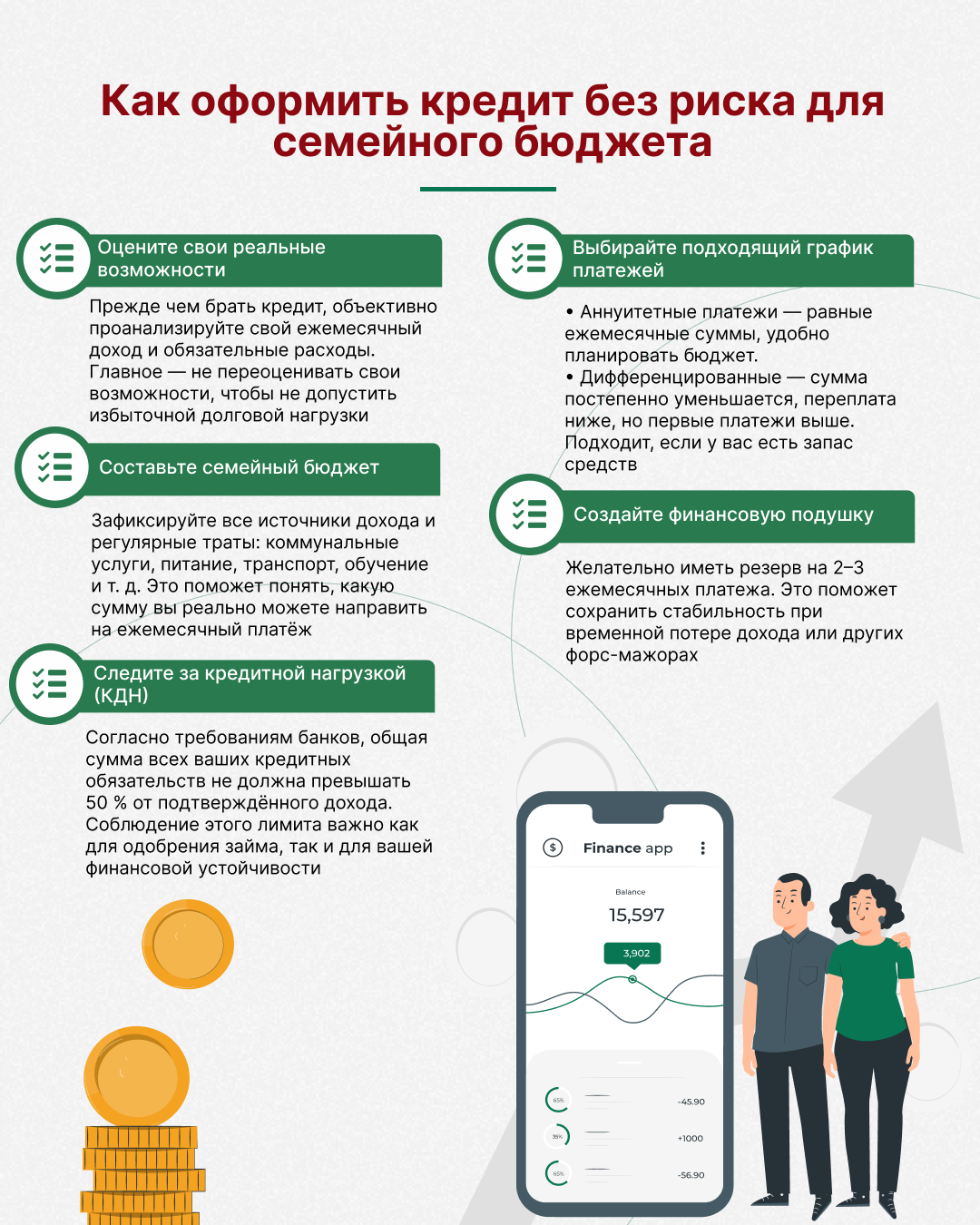 Допустим, семья берет 2 миллиона тенге на 3 года под 27% годовых. Аннуитетный платеж – 81 тысяча тенге в месяц. При семейном доходе в 400 тысяч тенге– это пятая часть бюджета. А если есть еще кредиты, коммуналка, аренда и ребенок в саду – начинаются проблемы. Вывод простой: прежде чем подписывать договор, садитесь с ручкой и листом. Пропишите все доходы. Потом – все расходы: от квартплаты до булочки утром. Сколько останется? Хватит ли на кредит? Не “на авось”, а реально.