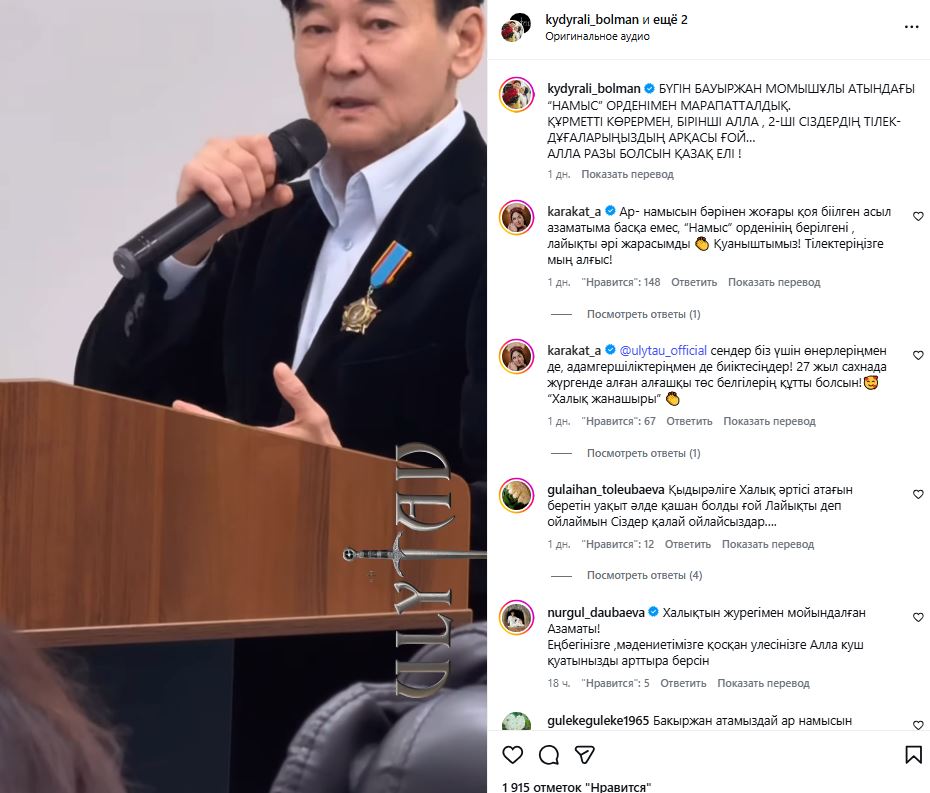 ”Сегодня нас наградили орденом “Намыс” имени Бауржана Момышулы. Уважаемые зрители, в первую очередь, это, конечно, воля Аллаха, а во-вторых – результат ваших молитв и пожеланий”.