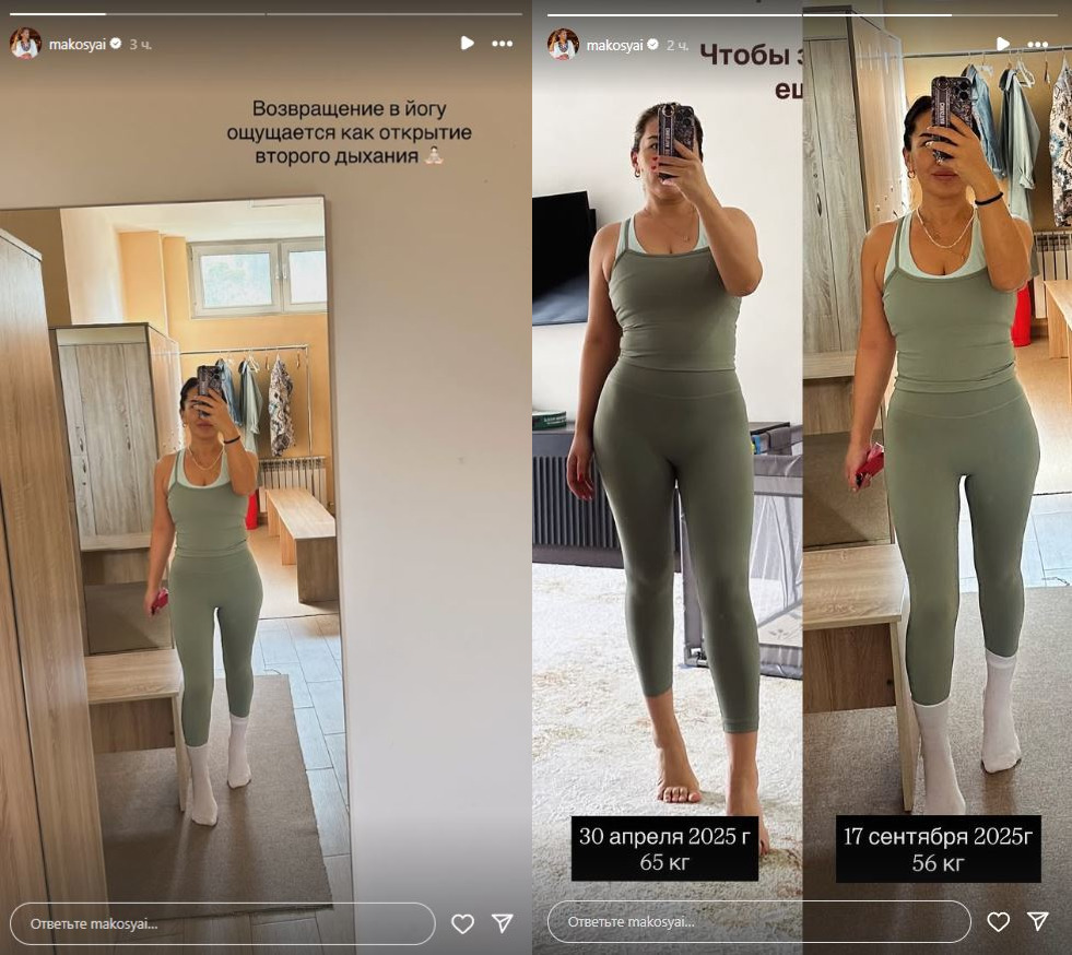 По словам артистки, она возвращается на йогу и показала себя, какая она была в апреле 2025 года и какая стала сейчас, в сентябре 2025 года.