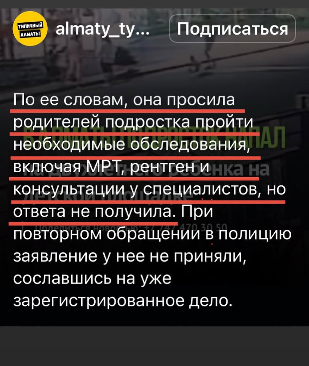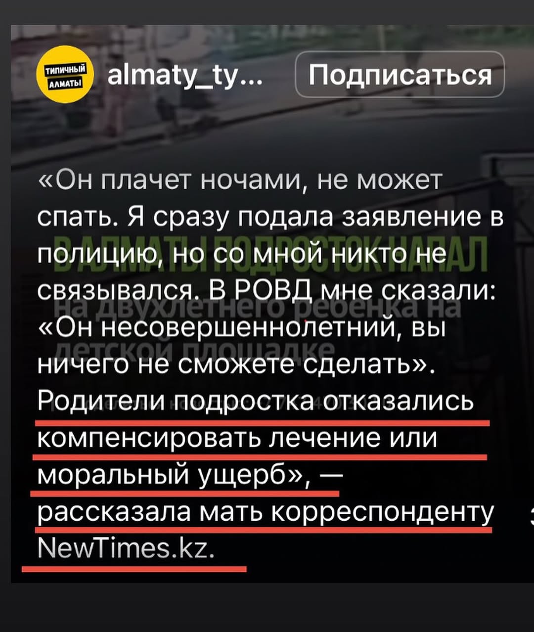 Далее мать пострадавшего малыша требовала у родителей подростка, по их словам, игрушки на 100 тысяч тенге, оплату полного чек-апа здоровья ее сына вплоть до анализов на витамины.