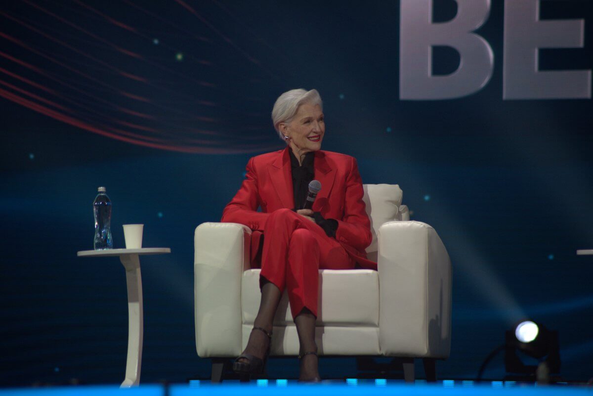 "Веселилась на сцене во время выступления на BeWomen. Также подписывала много книг, надев красивое пальто с ручной вышивкой, озвучила советы для жизни, полной приключений, красоты и успеха", - написала в Instagram Мэй Маск.