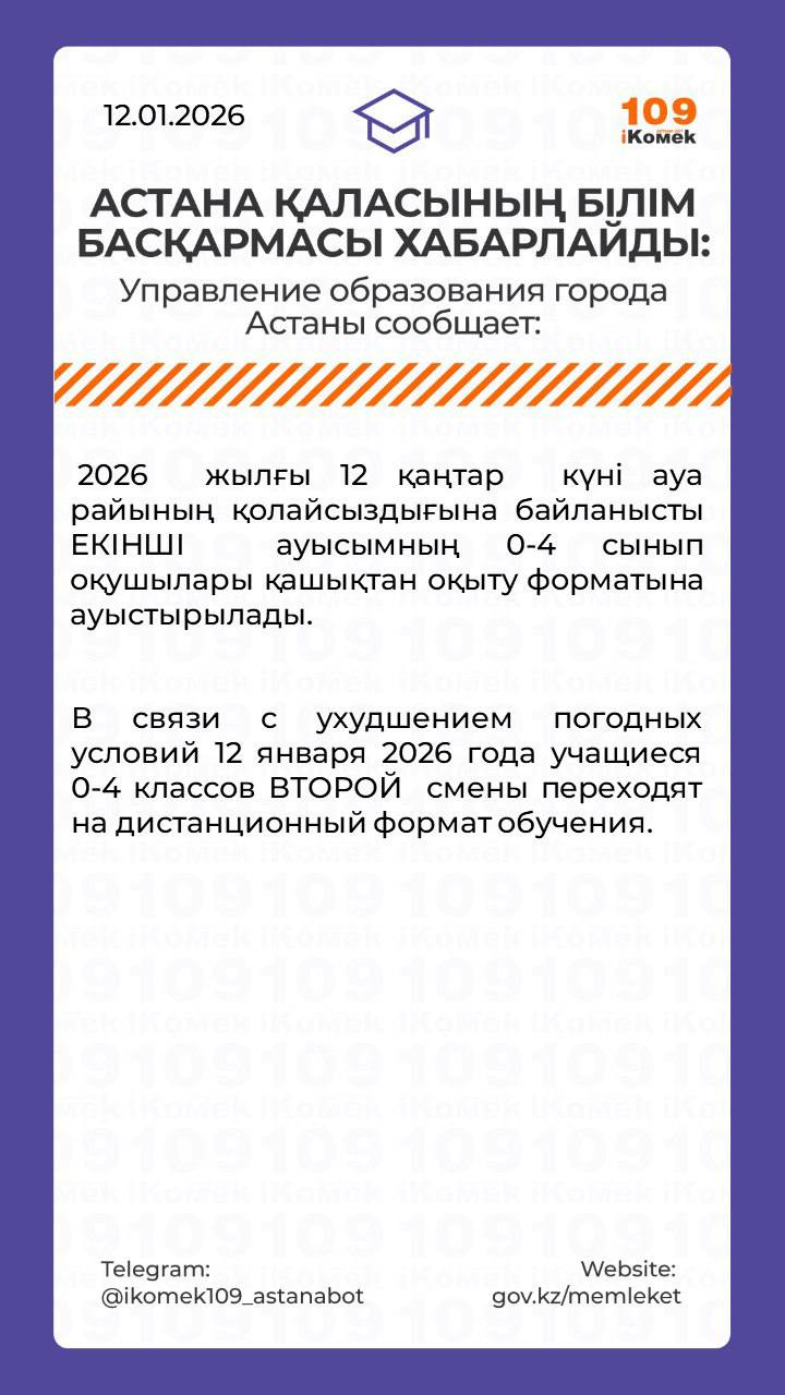 Управление образования Астаны сообщило, что в связи с ухудшением погодных условий ученики 0-4 классов второй смены будут обучаться дистанционно, передает Liter.kz.