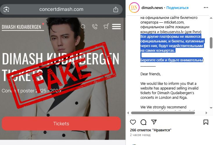 Команда казахстанского певца Димаша Кудайбергена сообщила о появлении сайта, распространяющего недействительные билеты на предстоящие концерты артиста в Лондоне и Риге, передает Liter.kz.