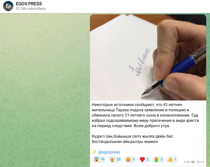 Как сообщает Telegram-канал Egovpress, 41-летняя жительница Тараза подала заявление в полицию и обвинила своего сына в изнасиловании.
