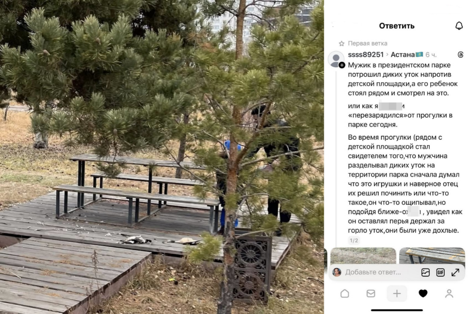 В социальных сетях распространилось сообщение очевидца о том, как неизвестный мужчина в президентском парке Астаны разделывал диких уток прямо напротив детской площадки. Рядом с ним, по его словам, стоял ребенок и наблюдал за происходящим, передает Liter.kz.