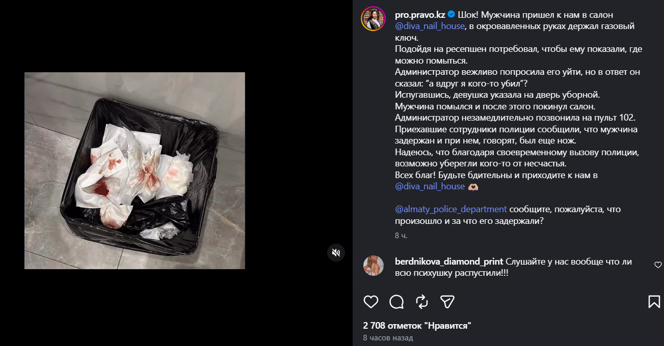 В социальных сетях распространяется информация о том, что в салон красоты зашел мужчина с окровавленными руками. В них он держал газовый ключ. Спокойно подойдя к стойке ресепшена, он попросил показать, где можно помыться, передает Liter.kz.