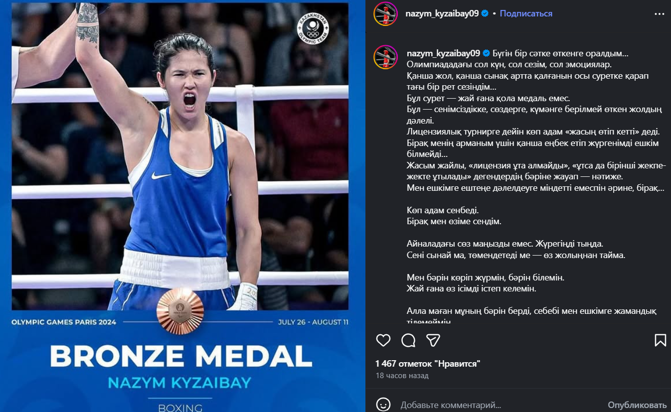 Казахстанская боксерша Назым Кызайбай поделилась эмоциональными воспоминаниями об Олимпийских играх, опубликовав пост в социальных сетях. Спортсменка призналась, что, глядя на архивное фото, вновь пережила те же эмоции и осознала, какой путь ей пришлось пройти, передает Liter.kz.