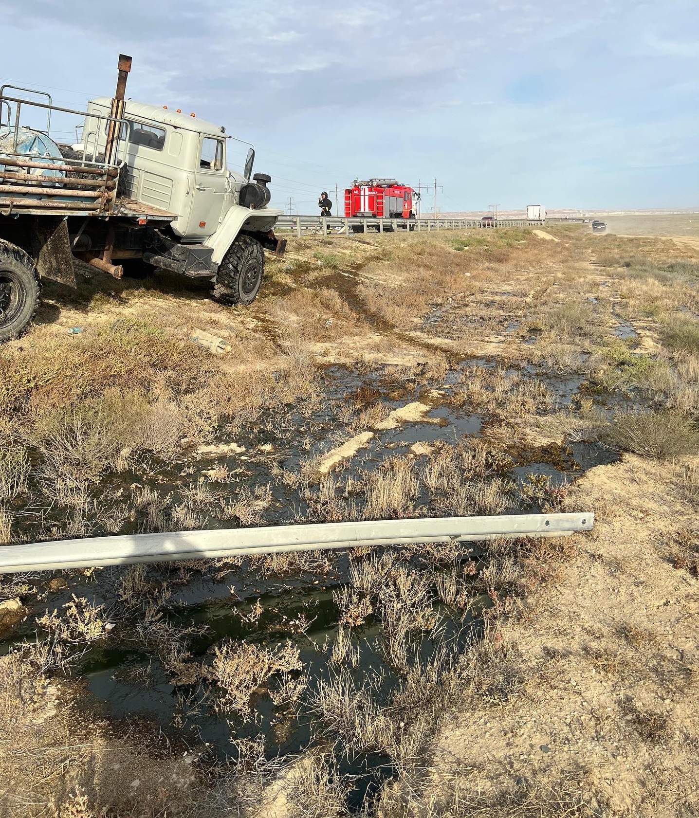 Нефть вытекла на землю из опрокинувшейся фуры в Мангистау