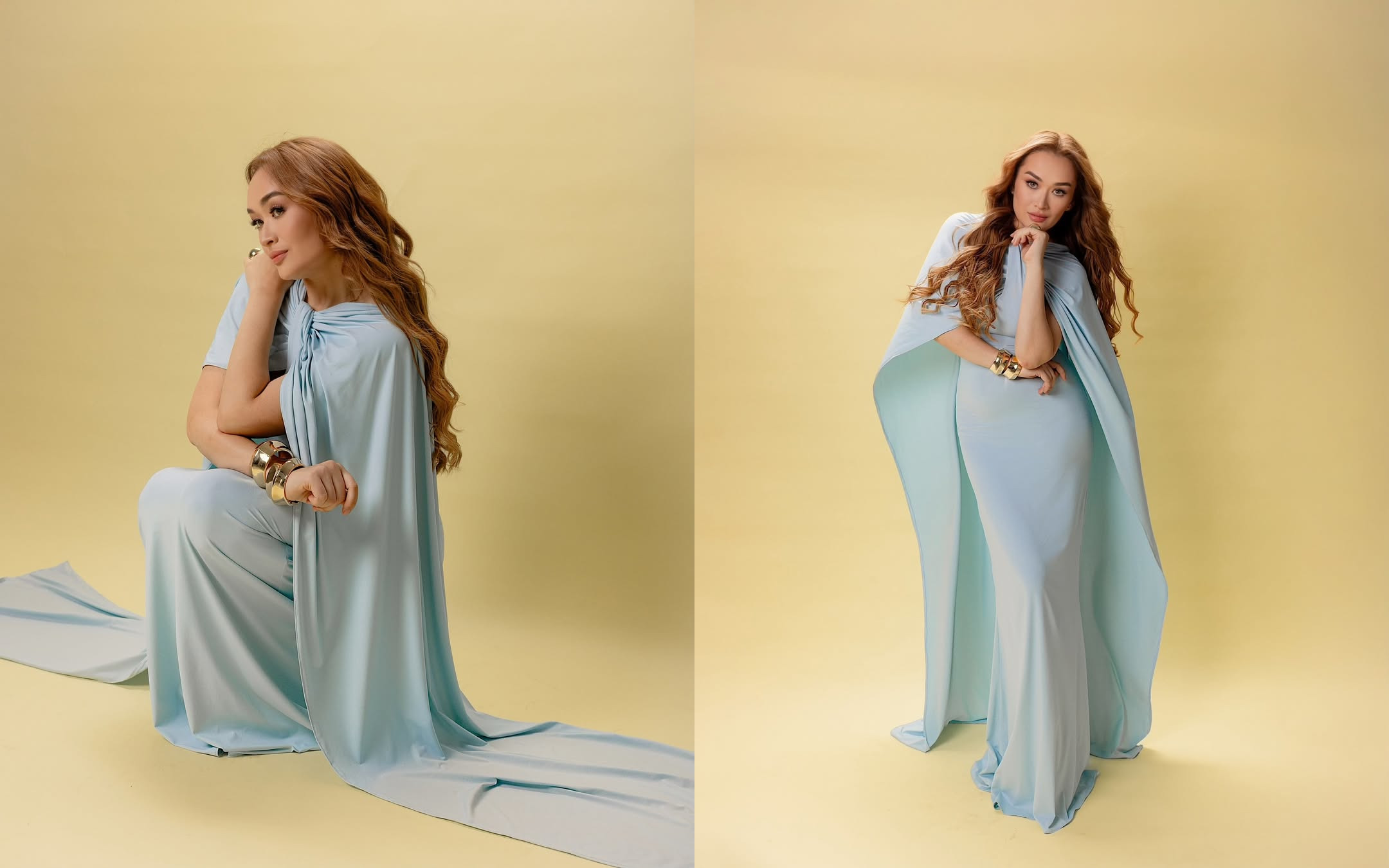 В своем аккаунте в Instagram Акерке Буркитбай опубликовала серию фото в длинном голубом платье с накидкой.