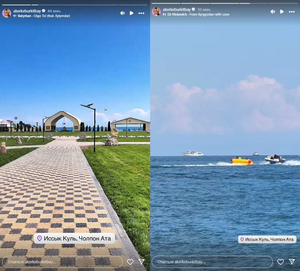 На кадрах в Instagram-stories упомянуты локации: Иссык-Куль, Чолпон Ата. Также Акерке показала чистейшее озеро, пляжный песок.